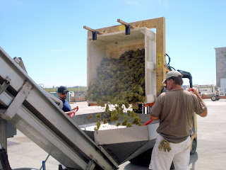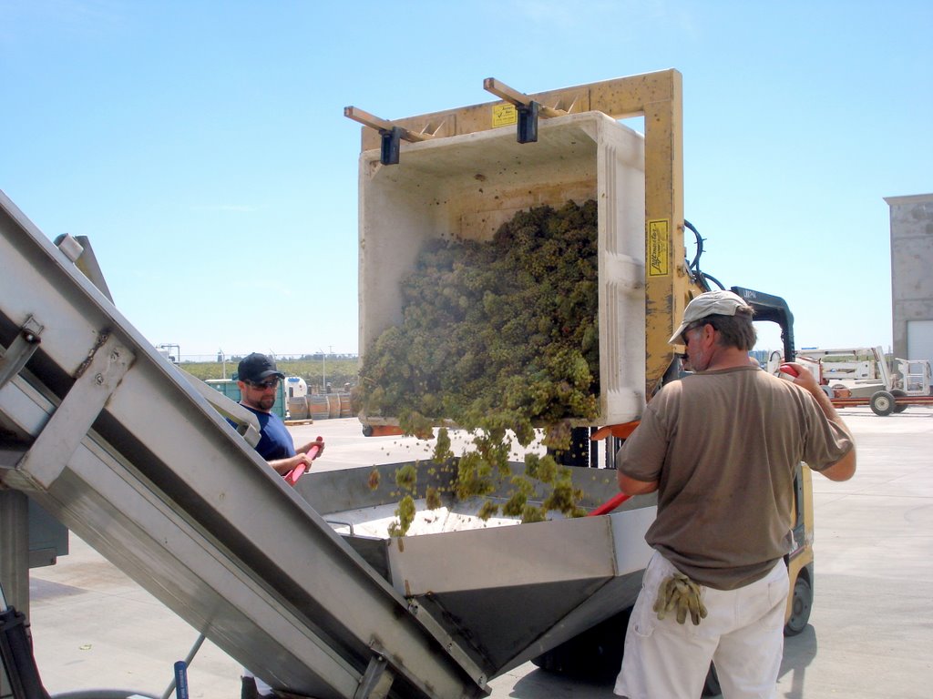 Macrobins were dumped one at a time into a hopper with an auger helping to ensure an even and less damaging delivery of grapes up a conveyer to load the press. Two cellar crew members equipped with plastic red rowboat oars help speed the work of the auger.